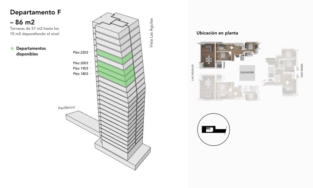 Departamento F – 86 m2 + terraza de 10 m2 hasta 51 m2 dependiendo el nivel :4 disponibles